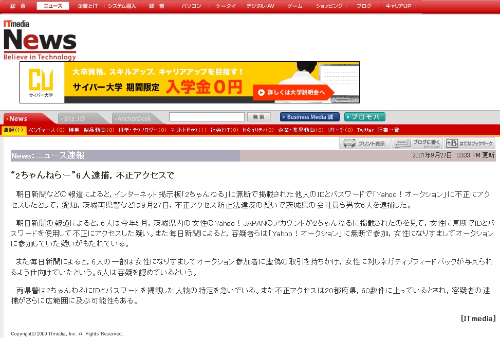 2chに貼られたID&passでヤフオク不正ログイン→問答無用で逮捕のときのニュース