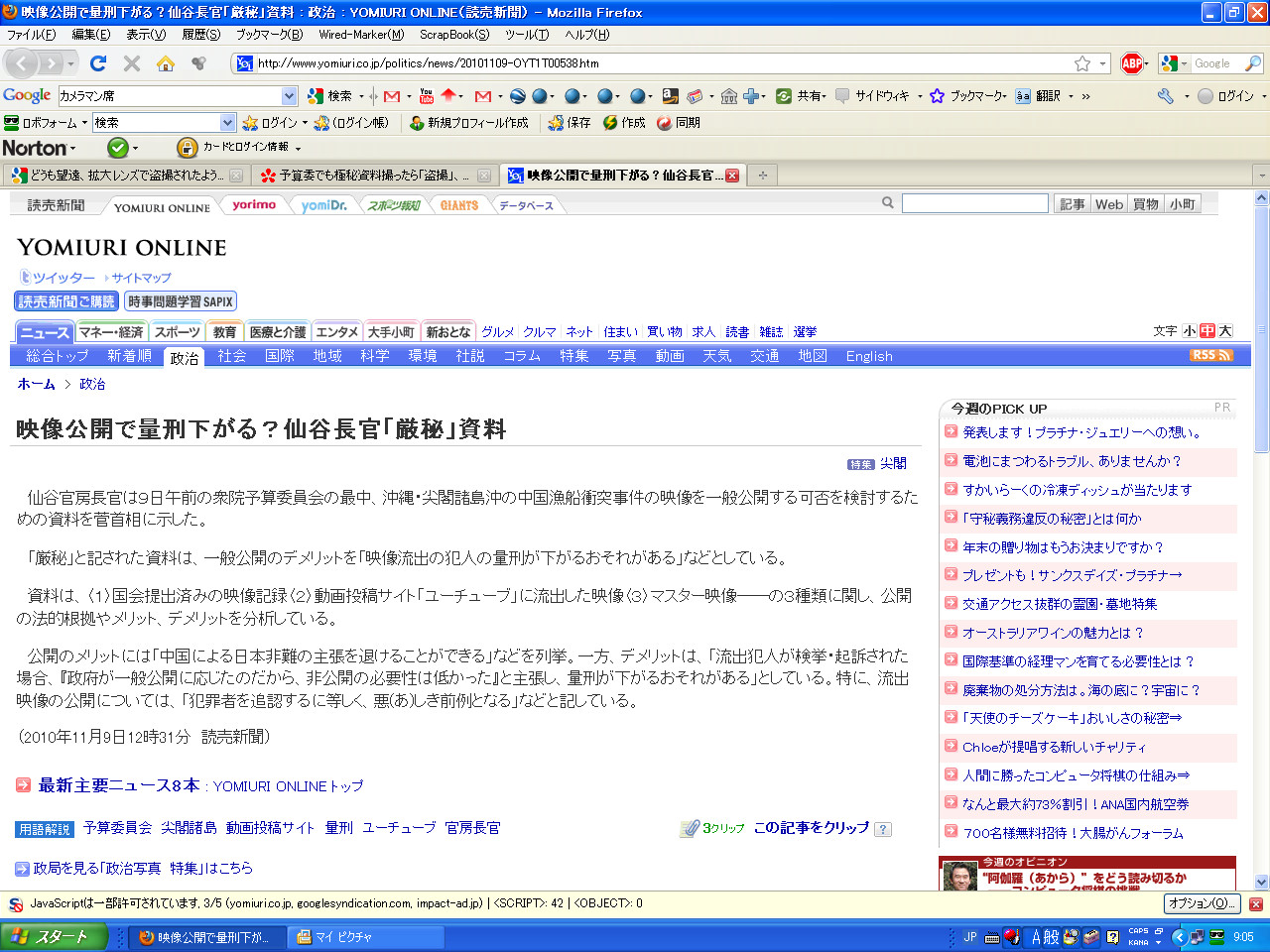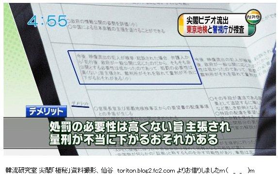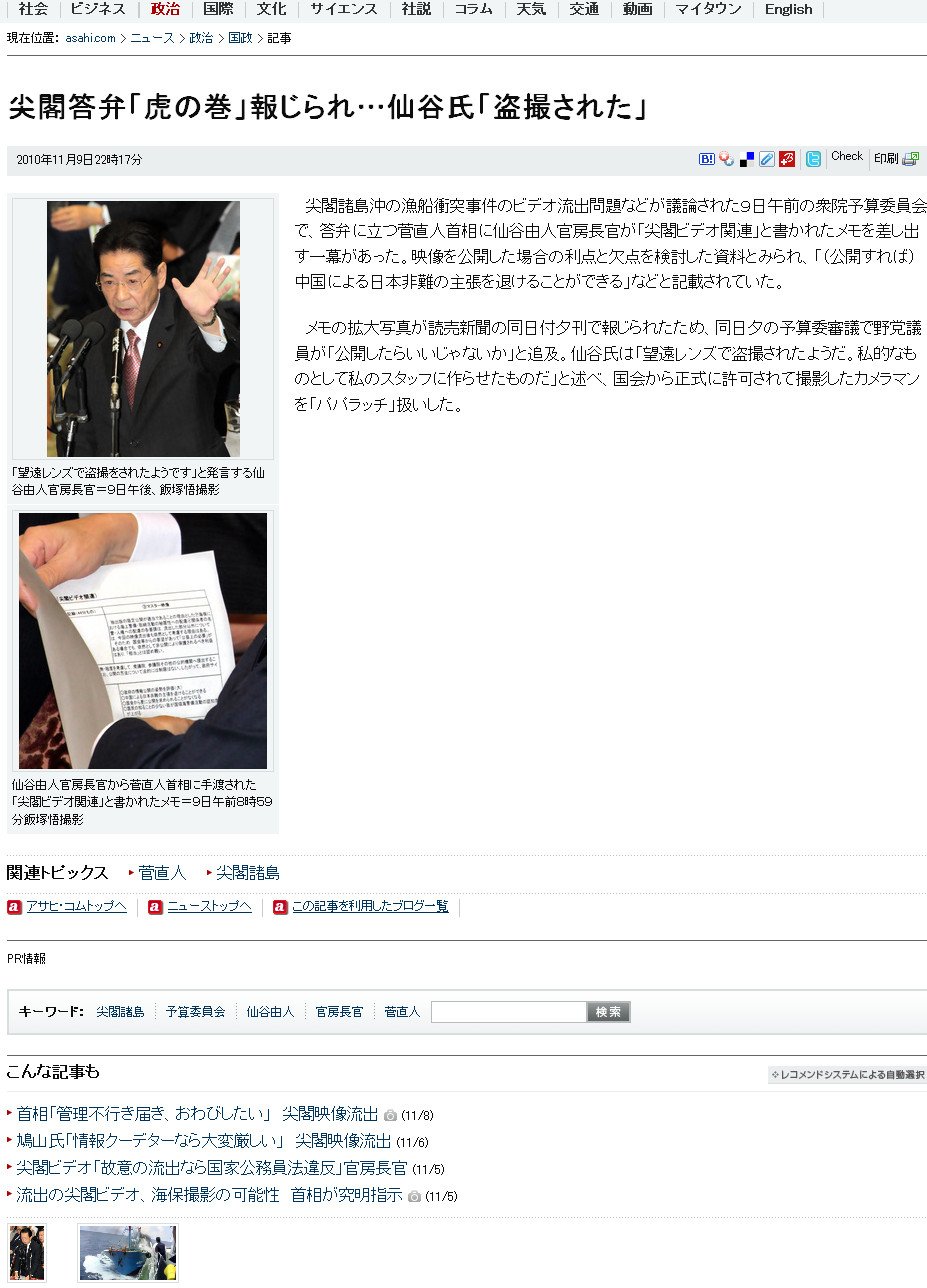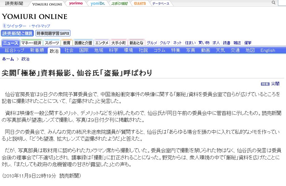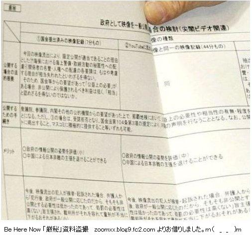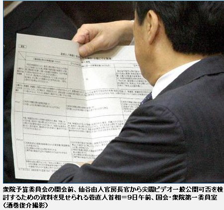 資料は映像を一般公開するメリット、デメリットなどを分析したもので、仙谷氏が同日午前の委員会中に菅首相に示したもの。読売新聞の写真部員が望遠レンズで撮影し、写真は9日付夕刊に掲載された。