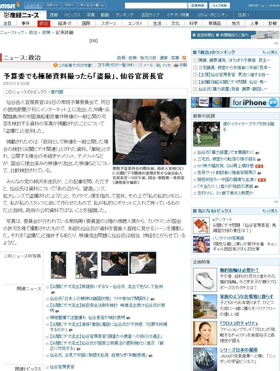 だが、写真部員は取材用に認められたカメラマン席から撮影していた。委員会室内で撮影を禁じられた物はなく、仙谷氏の発言は委員会後の理事会で 「不適切」とされ、議事録は「撮影」に訂正されることになった。野党からは、衆人環視の中で「厳秘」資料を広げたことに対し、「またしても政府の危機管理 の甘さが露呈した」との声も。