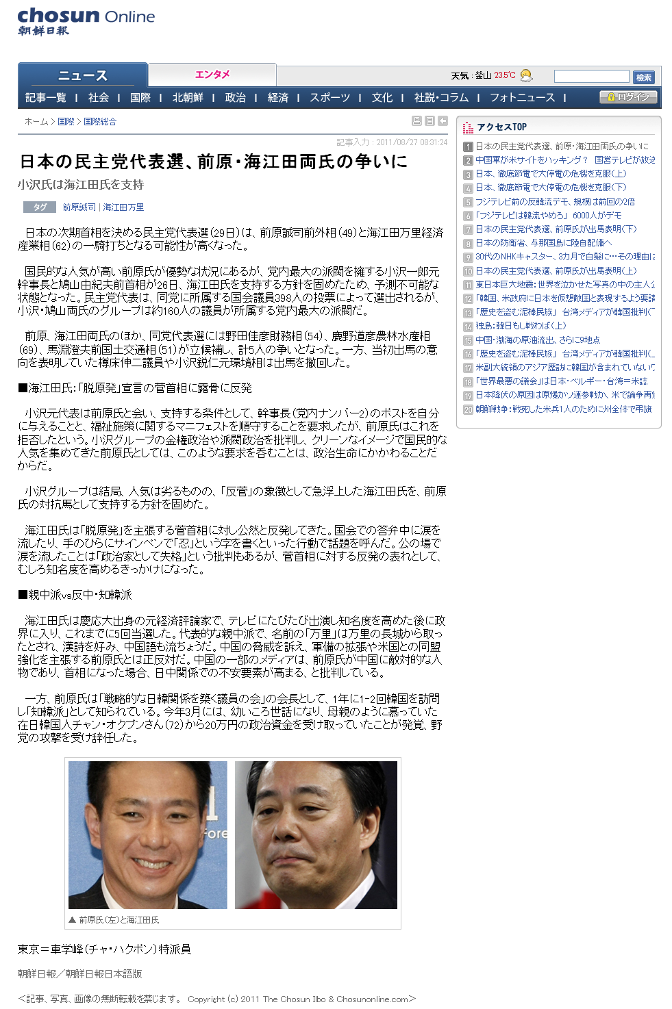 今回の民主党の代表選挙は韓国メディアも注目しているようですね。