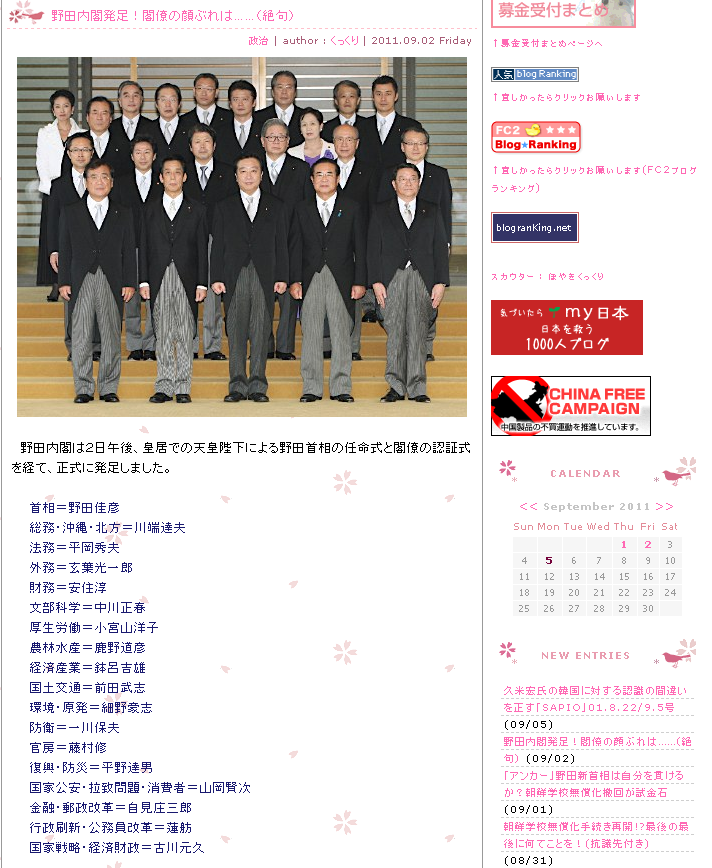 野田内閣発足!閣僚の顔ぶれは(絶句)2011.09.02 Friday