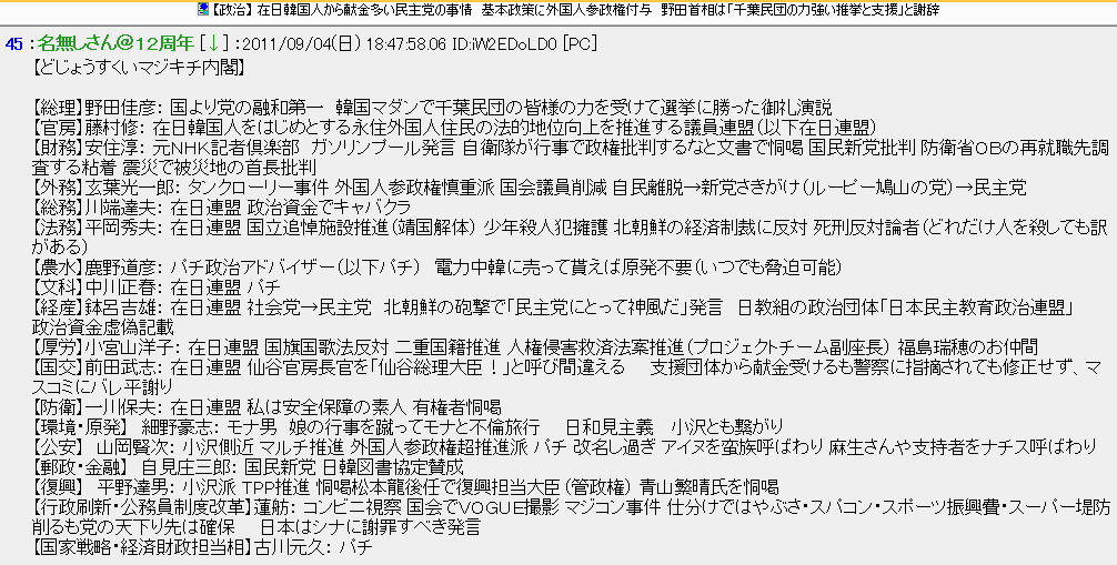 - 2011.09.05 野田ドジョウ内閣は在日参政権推進内閣でしょう