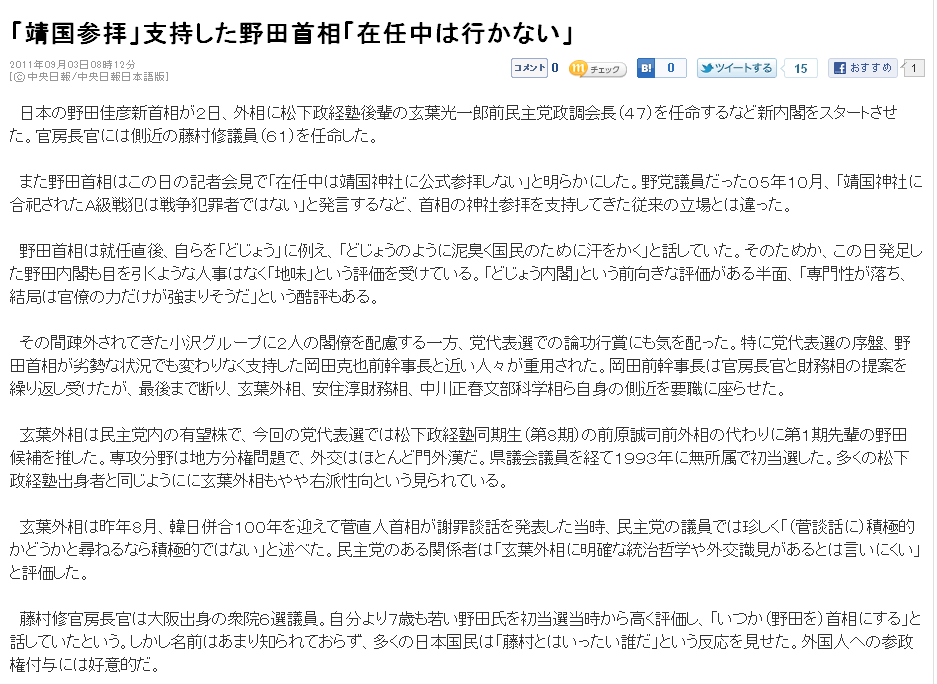 - 2011.09.05 野田内閣は靖国参拝しませんが
