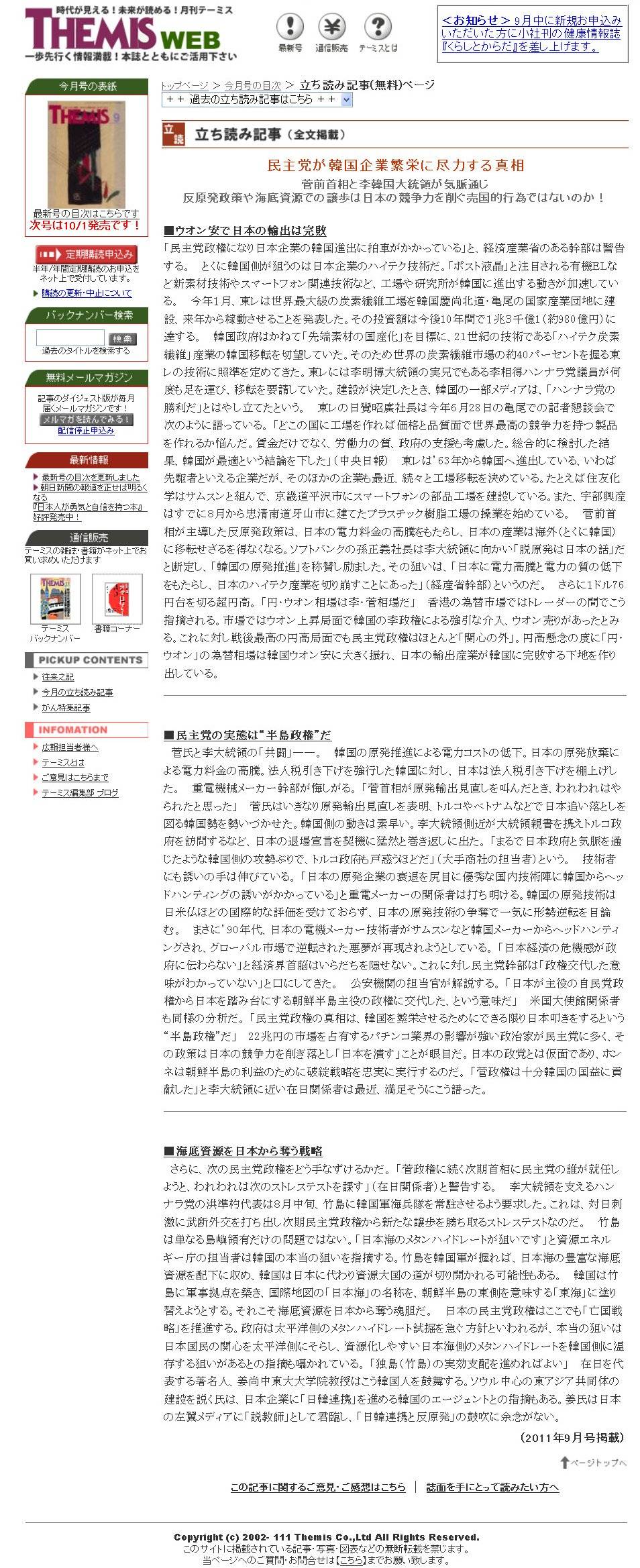 (2011年9月号掲載 民主党が韓国企業繁栄に尽力する真相 )