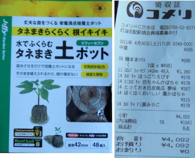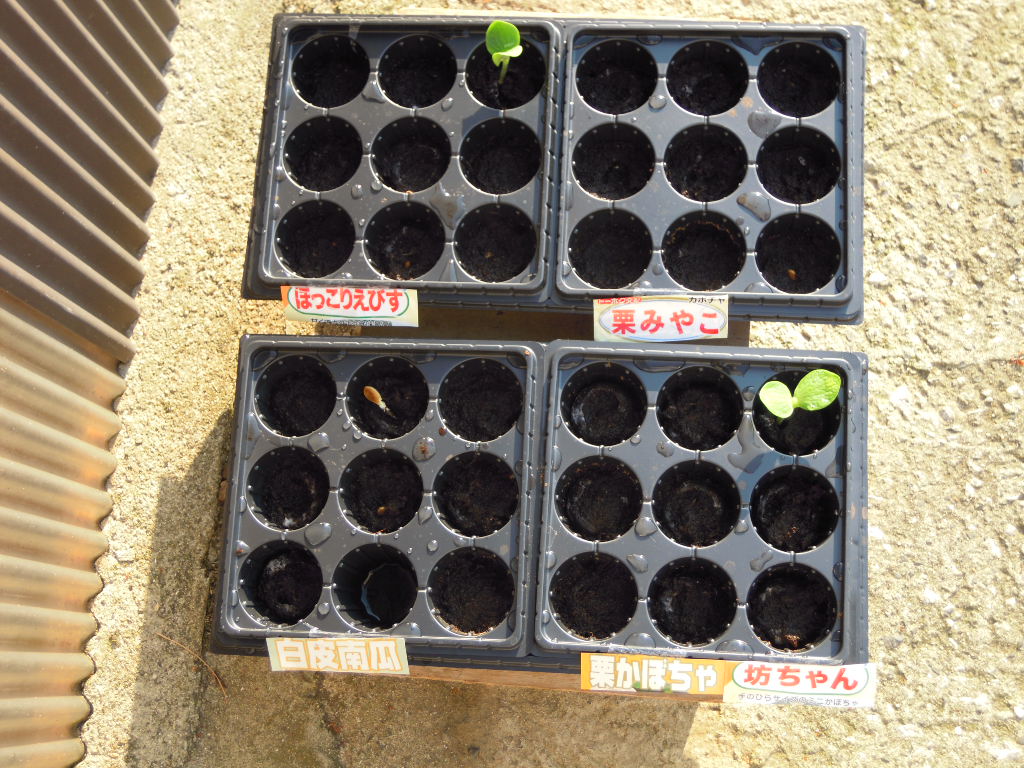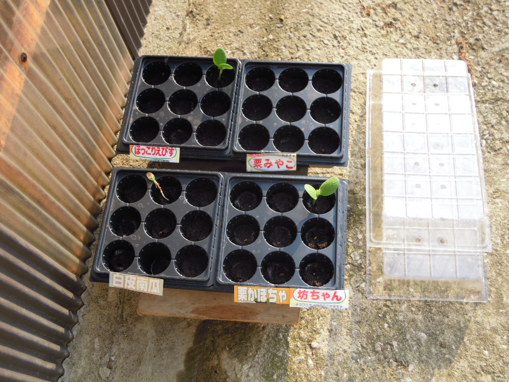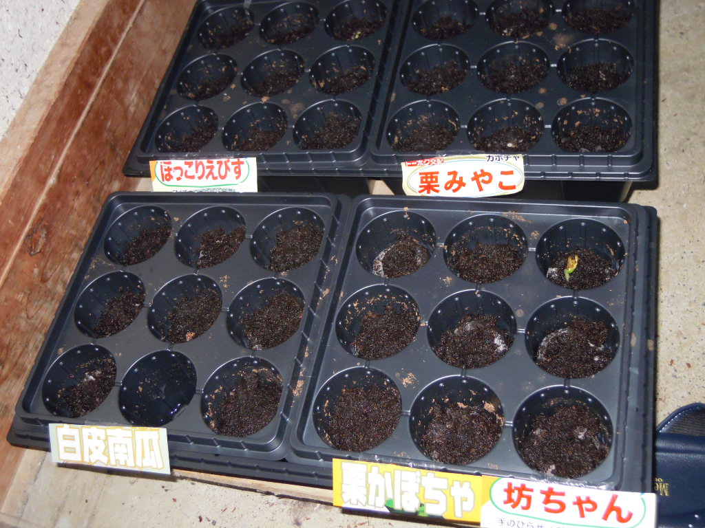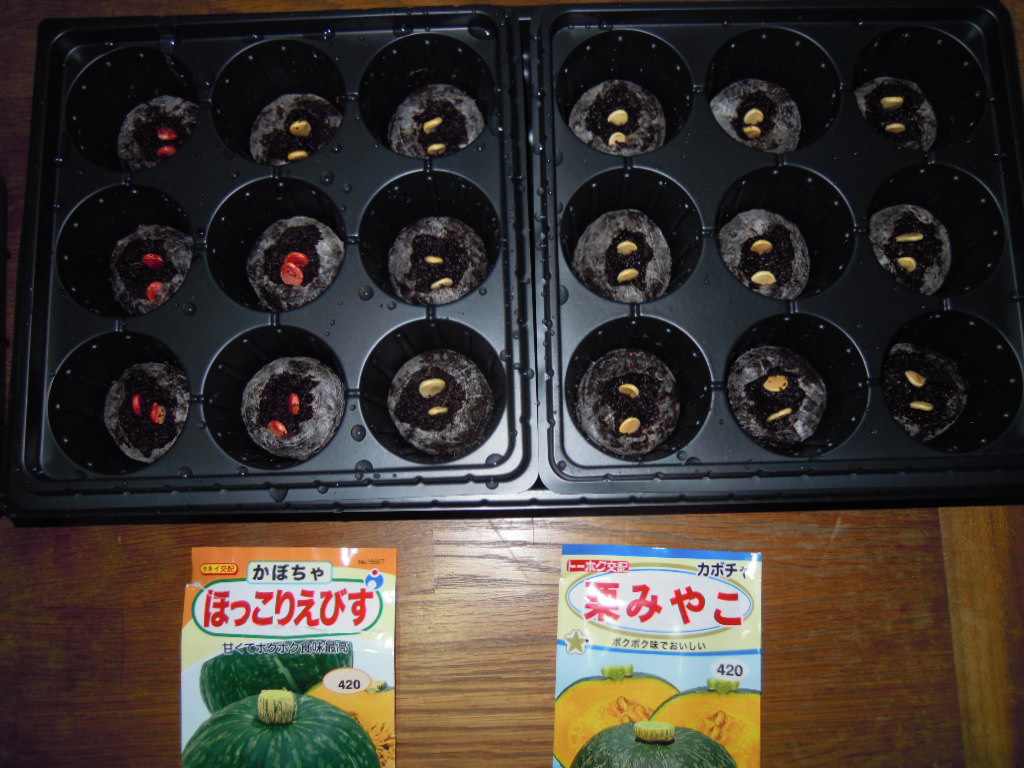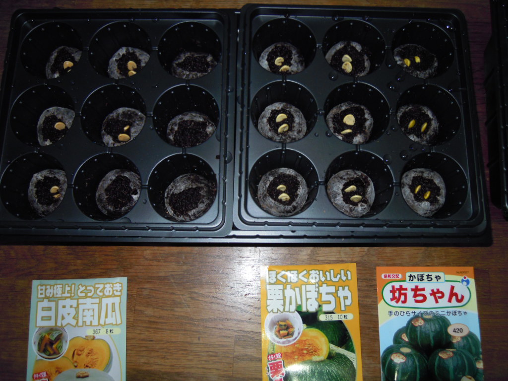 あとそれから野口種苗研究所から東京かぼちゃの種を買って紙容器にタネをまいてました。