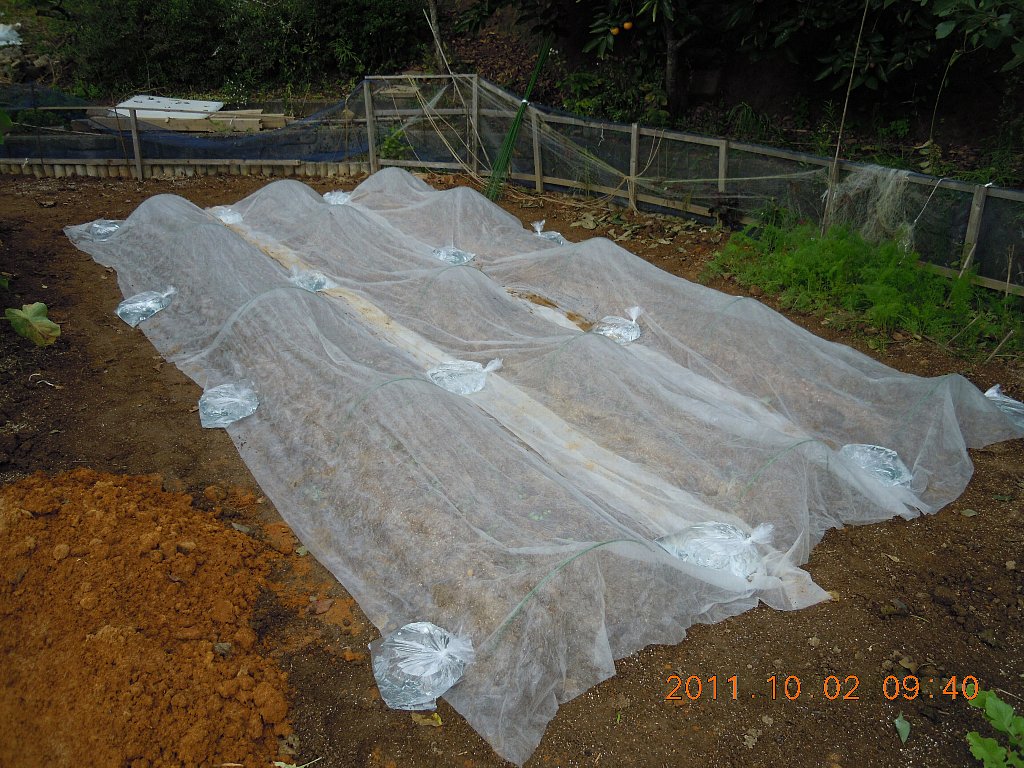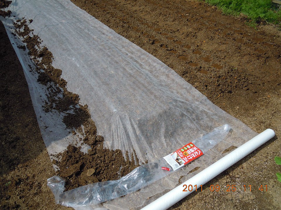 そのあとは水をやって、「べたがけ不織不布」をかけて完成です。