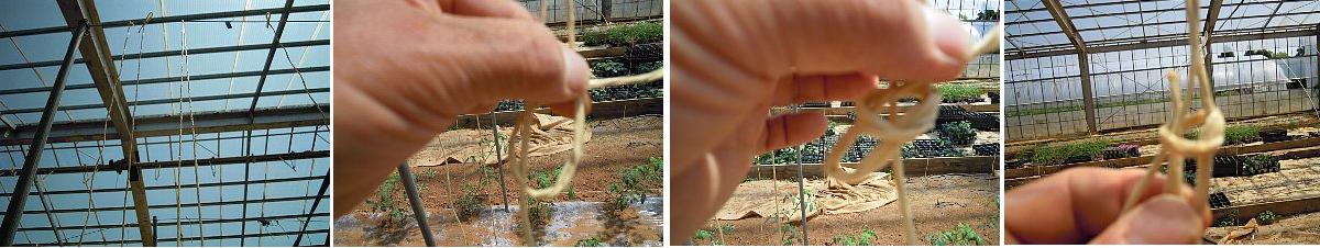 5月17日(火)ハウスに定植したトマトに上から支えるひもをつける。