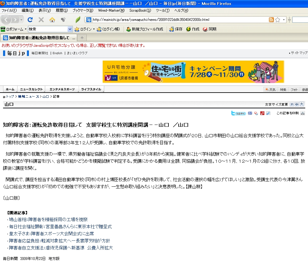 - 2009.10.23 【山口】知的障害者の運転免許取得を支援 自動車学校の教官が特別支援学校で特別講座[2009-10-23]
