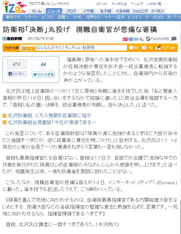 - 2011.03.19 防衛相「決断」丸投げ 現職自衛官が悲痛な寄稿