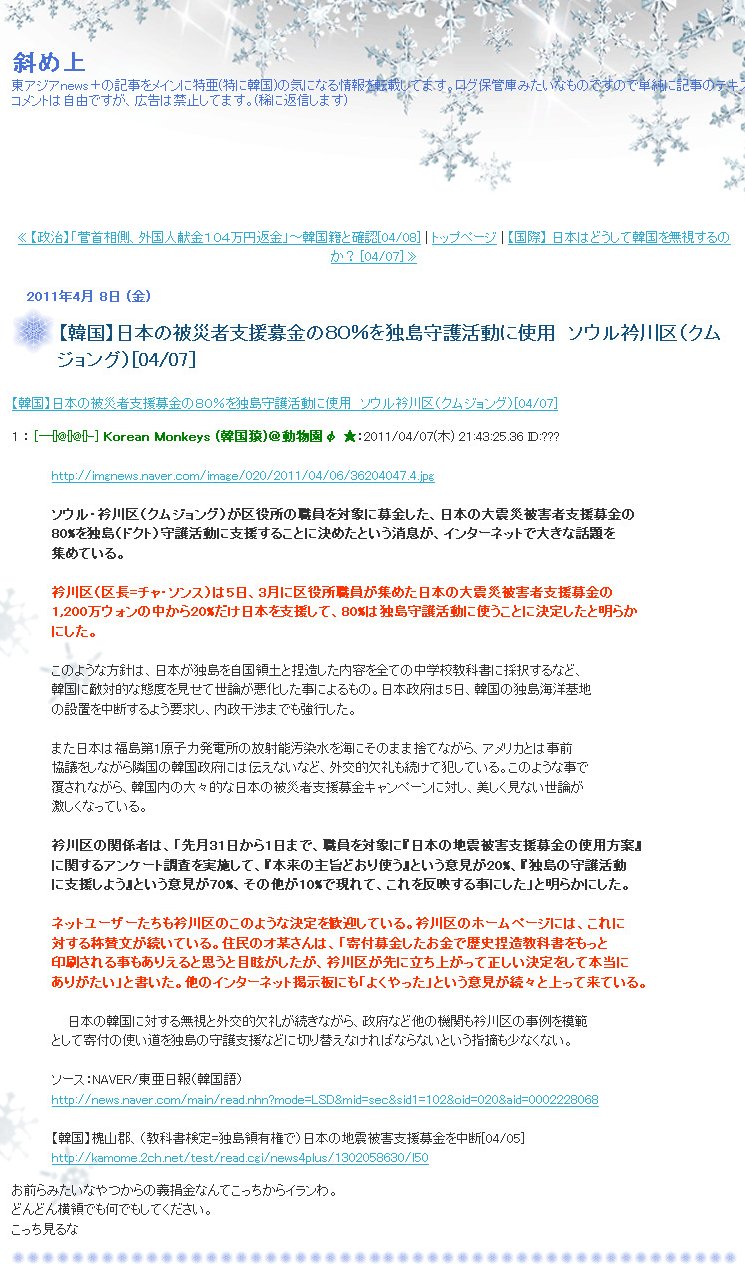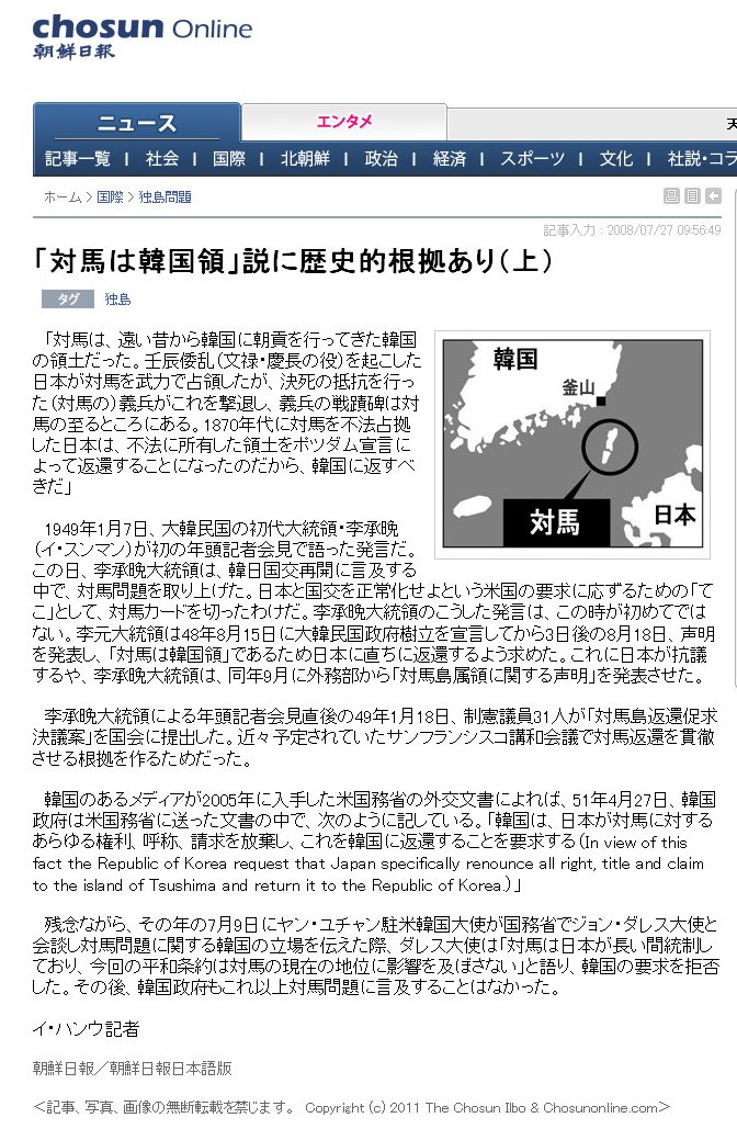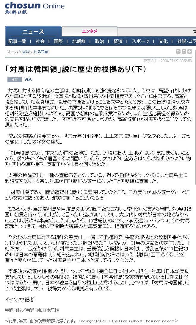 - 2009.01.20 【韓国毎日新聞社説】法令を隠蔽していた卑劣な日本・・・捏造と歪曲は卑劣で恥ずかしい所業と悟らせるため追求を続けよう[2009-01-07]