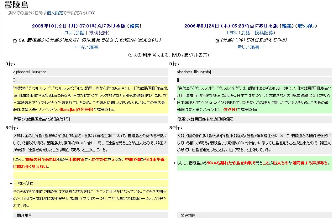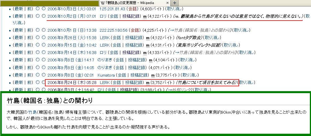 なんですが、鬱陵島(うつりょうとう)のウィキペディアの編集履歴を見ると