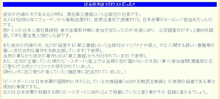 [ソース:辻元の夫はテロリストだった!! tp://www.h3.dion.ne.jp/~realrobo/go/tuji.htm]