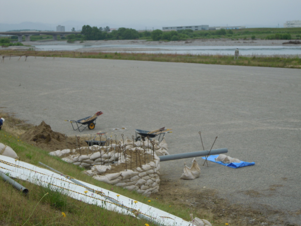 原因は一度土のうを上まで組み上げてからパイプを取り付けるために