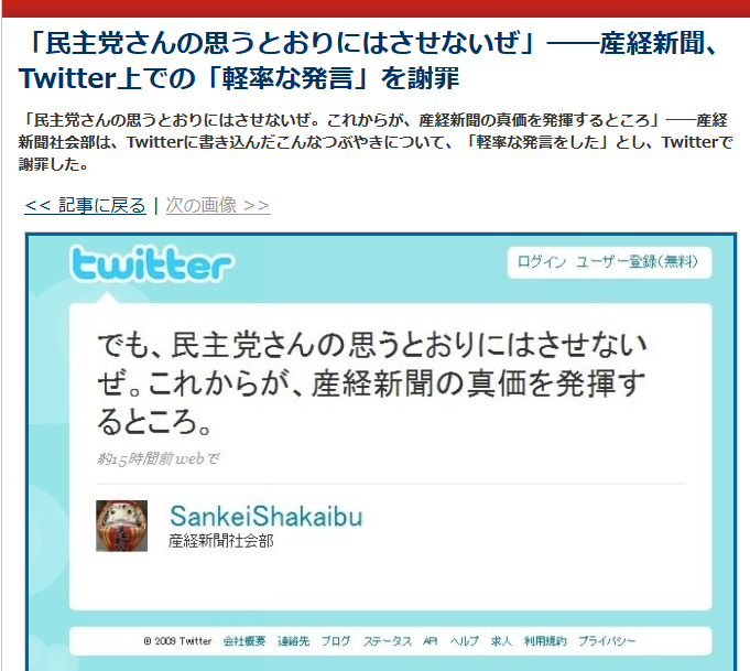 産経、twitterで民主の思い通りにはさせない!