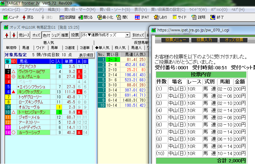 ヴィクトワールピサを付け足した5頭のボックスにしました。