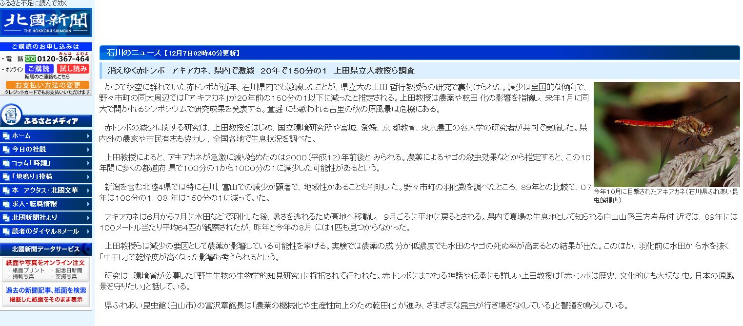 消えゆく赤トンボ アキアカネ、県内で激減 20年で150分の1上田県立大教授ら調査