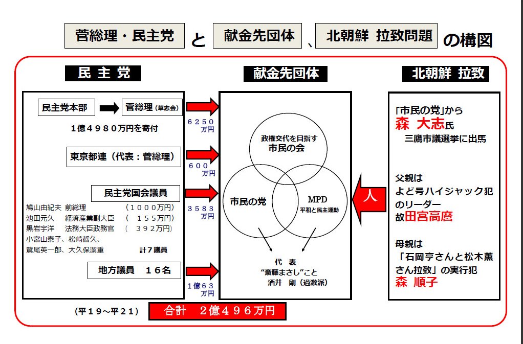 北朝鮮による日本人拉致事件の容疑者に関連する団体への献金の流れを示したもの。